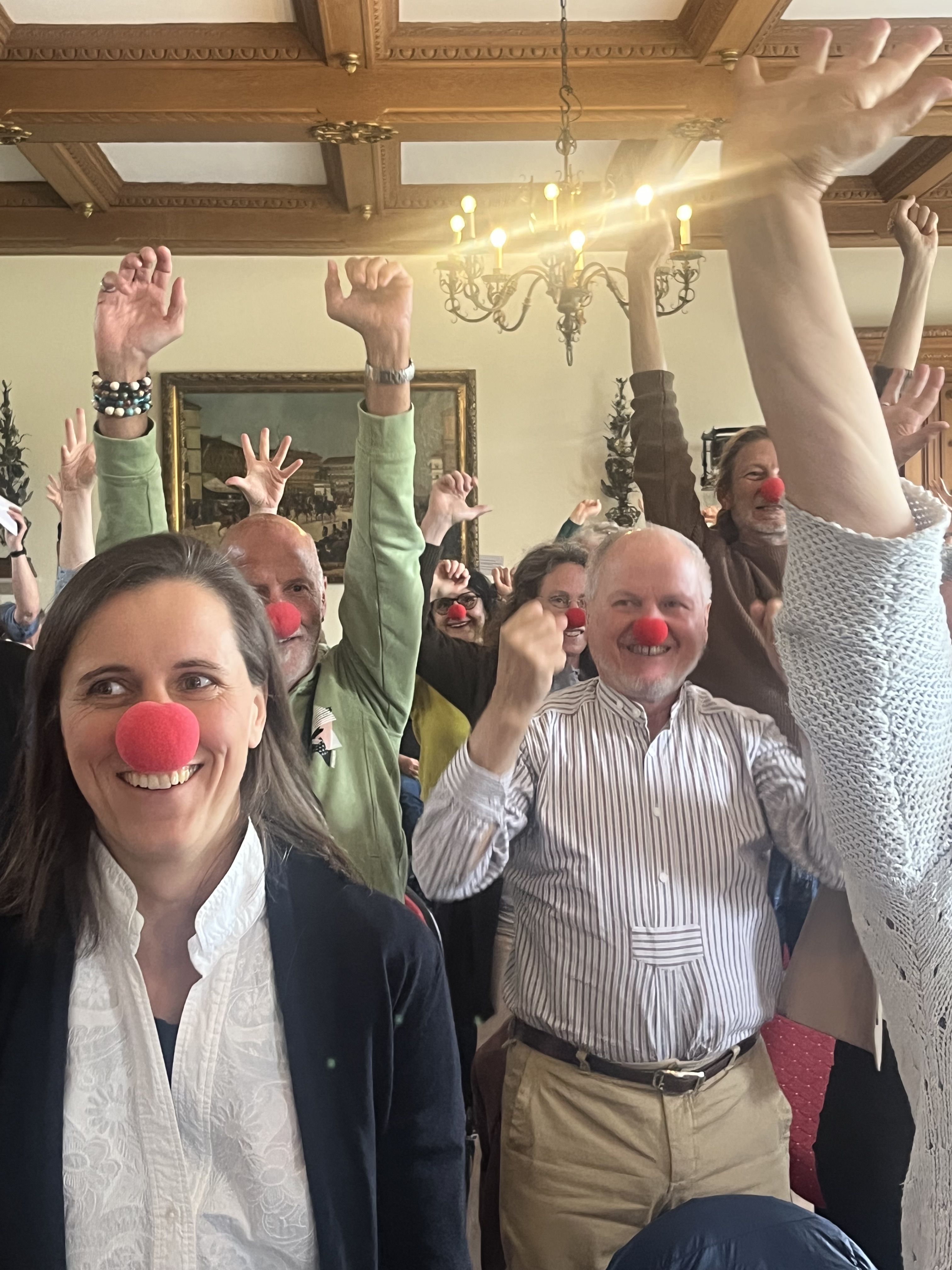 Udo Berenbrinker, Leiter der Tamala Clown Akademie Konstanz, verteilte gleich zu Beginn seines Vortrags „Der Humor und die Komik des Clowns“ rote Clowns-Nasen an das Publikum, das daraufhin begeistert das Clowns-Leben ausprobierte (Foto). Clowns und Clowns-Nasen – die kleinste Maske der Welt – gibt es in jeder Kultur und in jedem Land. Nur die Nazis haben Clowns verboten. Ungewöhnliche Dinge zu tun, das sei die Aufgabe jedes Clowns. Ein Clown sei dazu da, anderen Freude zu schenken, nie dürfen seine Aktionen daher auf Kosten anderer gehen. Als Clown definiere er HUMOR daher mit den Begriffen H=Heiterkeit, U=unerwartet, M=menschlich, O=Offenheit und R=Respekt. Ein Clown kann Gefühle durch Übertreibung ausdrücken. Auch Cartoons basieren oft auf Übertreibungen. Ein Clown kann anderen auch beibringen, Freude zu aktivieren. Nach zwei Jahren Clowns-Ausbildung an der Tamala Akademie wird man nicht mehr dieselbe Person sein. „Man wird einsamer, denn man akzeptiert nicht mehr alles“, so Berenbrinker.