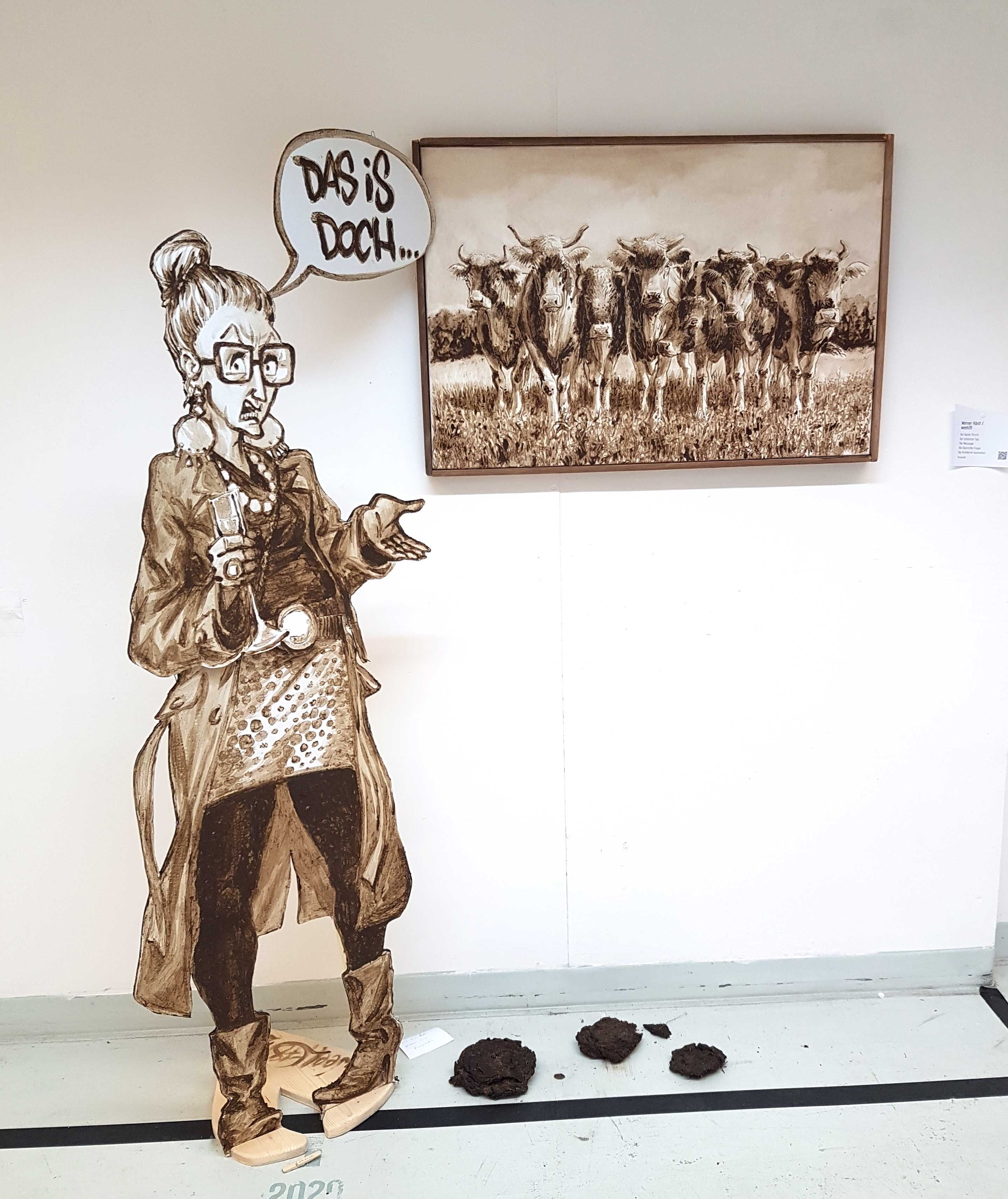 Eine Kuhherde beobachtet neugierig das Publikum. Aus der Nähe und der Ferne betrachtet ergibt sich die Meinung der Kritikerin. Sie hat Recht, hier wurde mit Kuhscheiße gemalt!