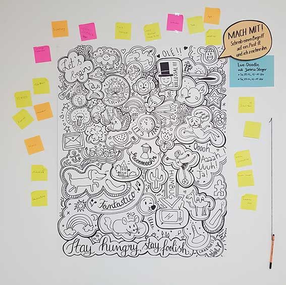 Live Doodle - ein Kunstwerk zum mitmachen: zufällige Begriffe vom Publikum werden grafisch aufgefangen und finden sich in einer Art Tableau der Fantasie und des Humors zusammen.